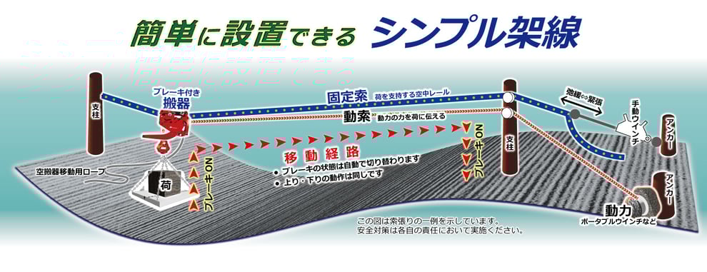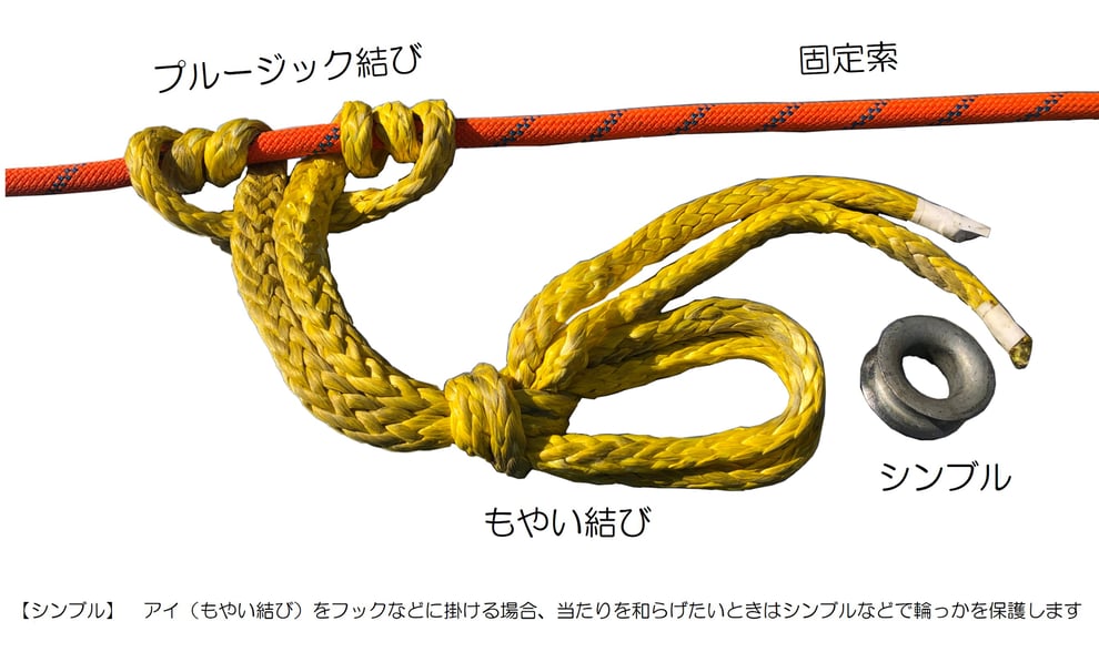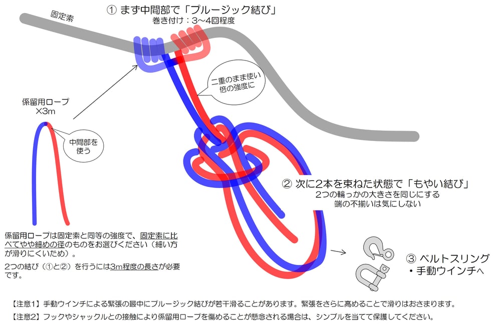 この写真は、架線の固定索(主索)となる繊維ロープを係留し、手動ウインチ(写真ではチェーンブロック)で緊張させる方法を示しています。この係留用ロープにもやい結びを施しています。