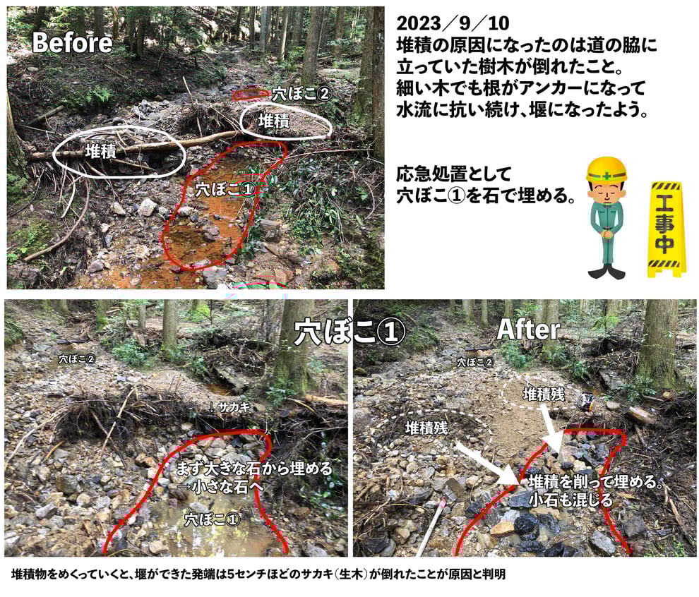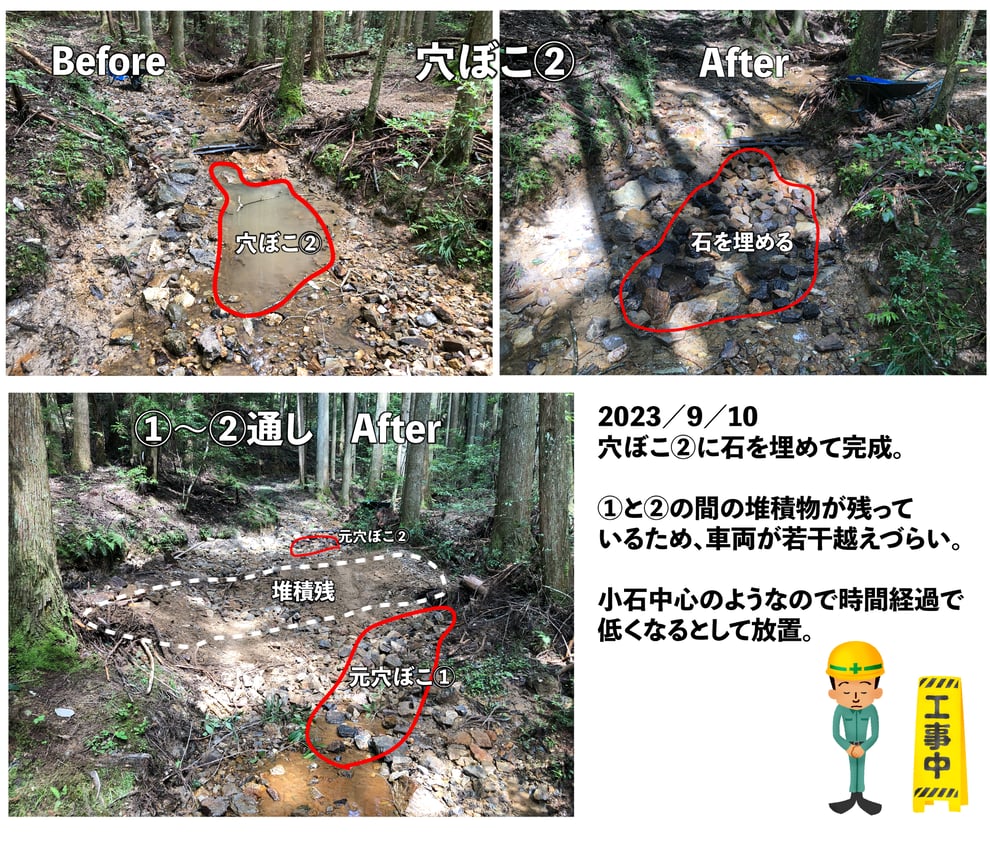 元々轍(わだち)はできていたのですが、激しい水流で深くえぐられ、オフロード車であってもタイヤがはまるとスタックしかねないほどの深い轍になってしまいました。5年前の工事では右側の轍には石を詰めていましたが、左側の轍は対策を疎かにしていたことが判明しました。5年前の認識レベルが低かったことを思い知らされました。