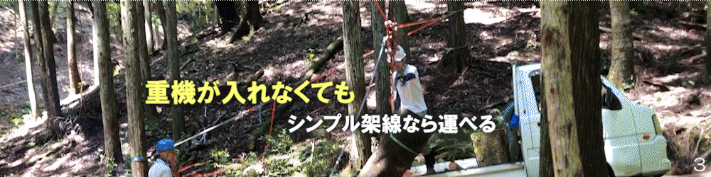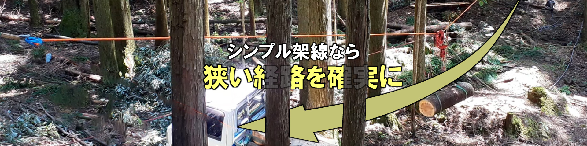 架線(かせん)とは空中に張ったロープのことをいいます。道のない山林や斜面では架線による運搬が効果的です。ロープを使ったお仕事をされる方には、知っておいて損のない技術です。シンプル架線は、架線方式の中で一番単純で便利な方式です。