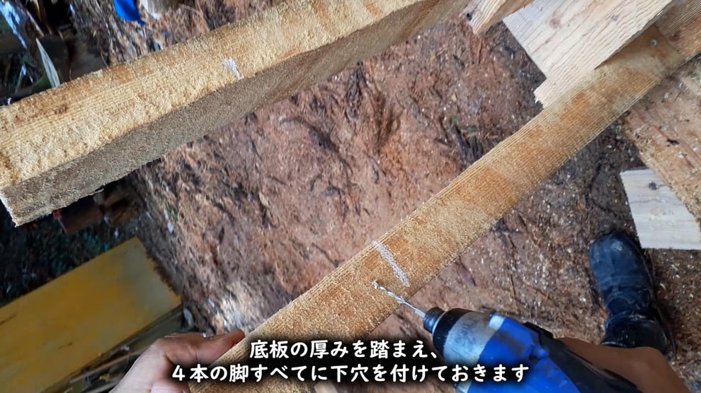 そして底板の厚みを踏まえ、4本の脚すべてに下穴を付けておきます