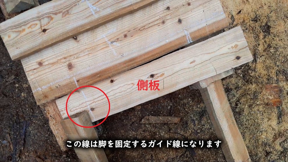 側板を天板に平行に並べ、脚の位置を示すガイド線を側板にも写します。