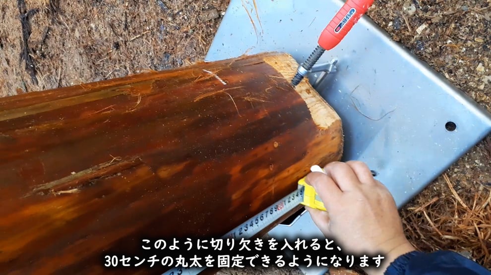 立介の仕様では最大28センチまでとなっていますがこのように切り欠きを入れると、30センチの丸太を固定できるようになります。