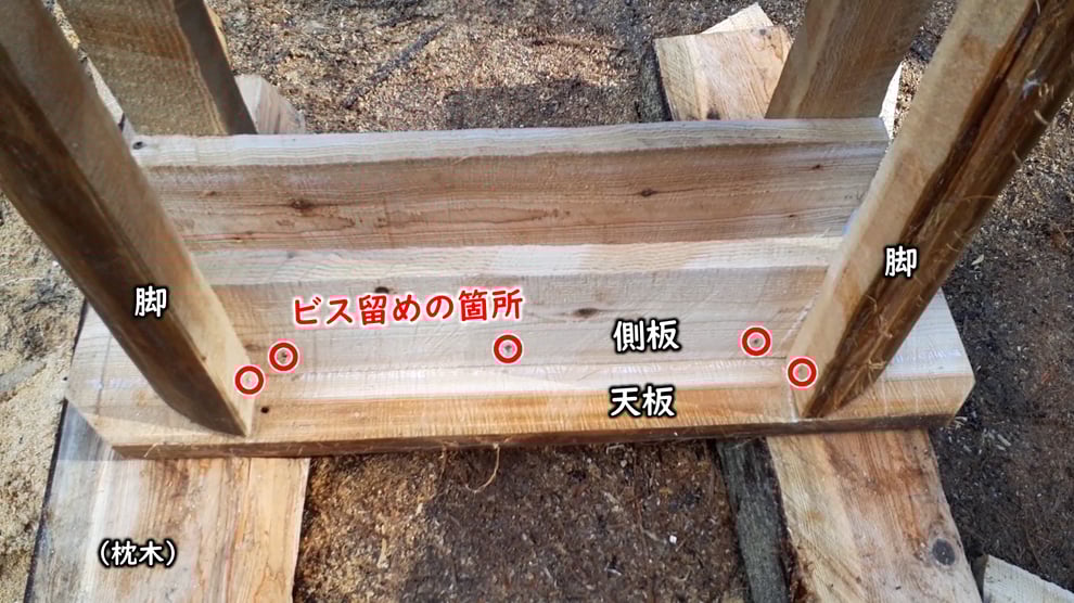 流れ的には、2本の脚を側板に固定したものを2セット作り、それらを天板に固定するという具合です。