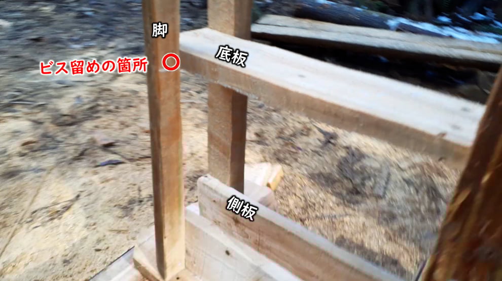 ここで使っているビスは全て65ミリです。貫通する手前の板厚が30~40ミリのため65ミリにしました。