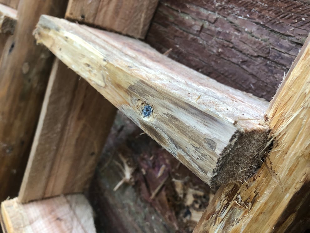 踏み台を出っ張らせた場合、一番最初に壊れるのがここです。出っ張った部分がもげ落ちやすくなっていますので、ビスを打ち込んでおきます。各踏み板に2本ずつです。