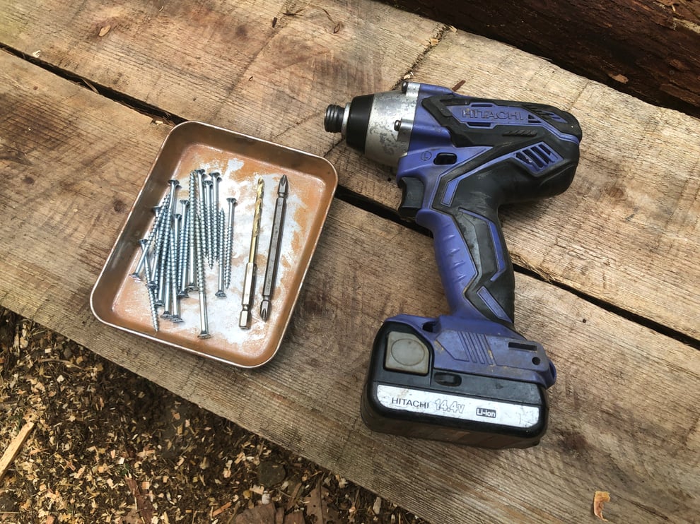 踏み板と側板の接合にはビスを使います。今回使用したのは65ミリです。またインパクトドライバーはこうしたチェーンソー木工でも重宝します。木材の状態によってはビスが最後まで貫通しにくいときがあるため、下穴空け用に3ミリぐらいの木工ドリルビットがあるといいでしょう。下穴の深さは表層から数センチ程度でいいと思います。