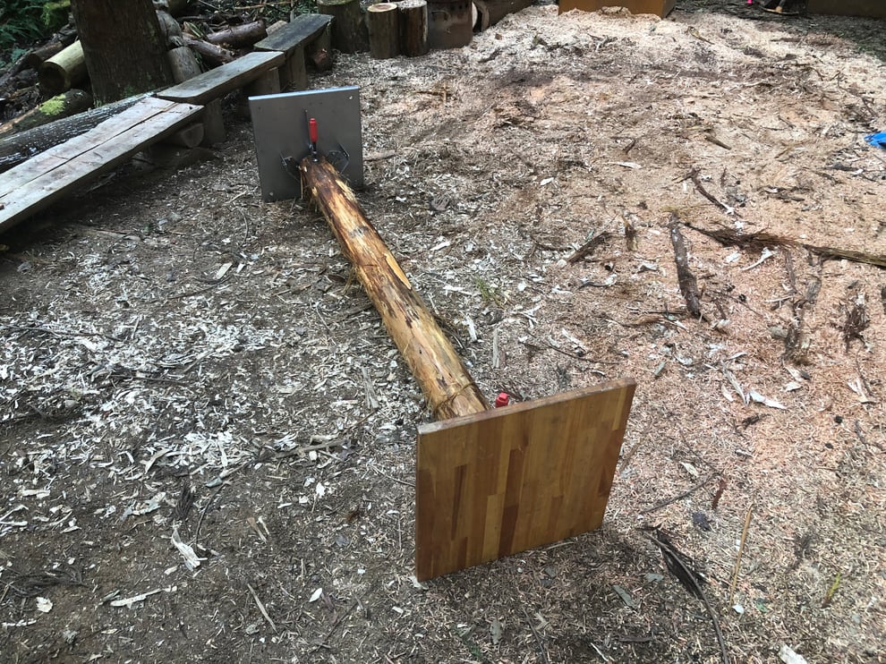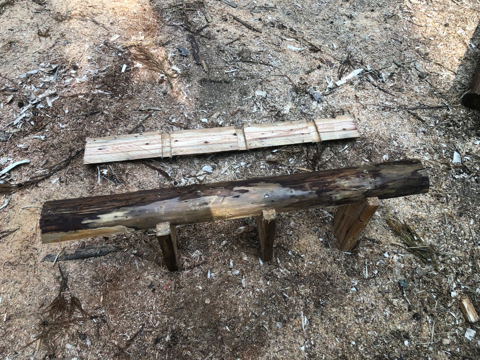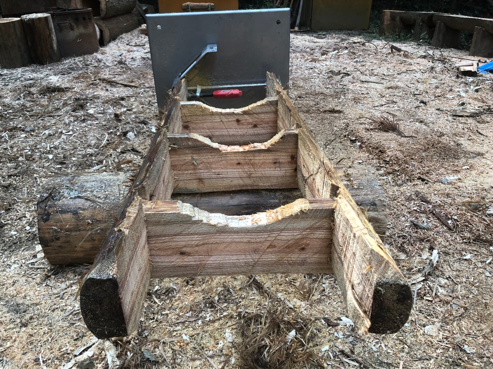 中央の板(踏み板にあたる)を立介で水平にクランプし、枕木で高さを作ります。予めチェーンソーで切れ目を入れたところが残っています。