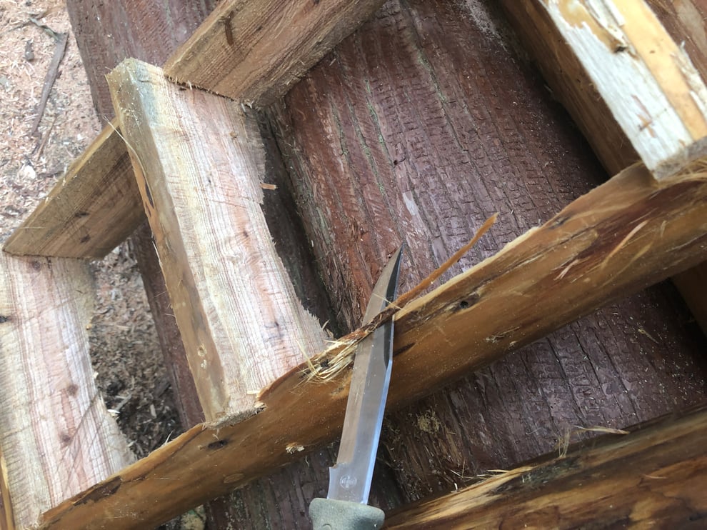 次はナイフを使った面取りです。チェーンソーの切り口はバリが出るため、バリ落としにはこうしたナイフが役立ちます。鋭角になったところもナイフで削ります。