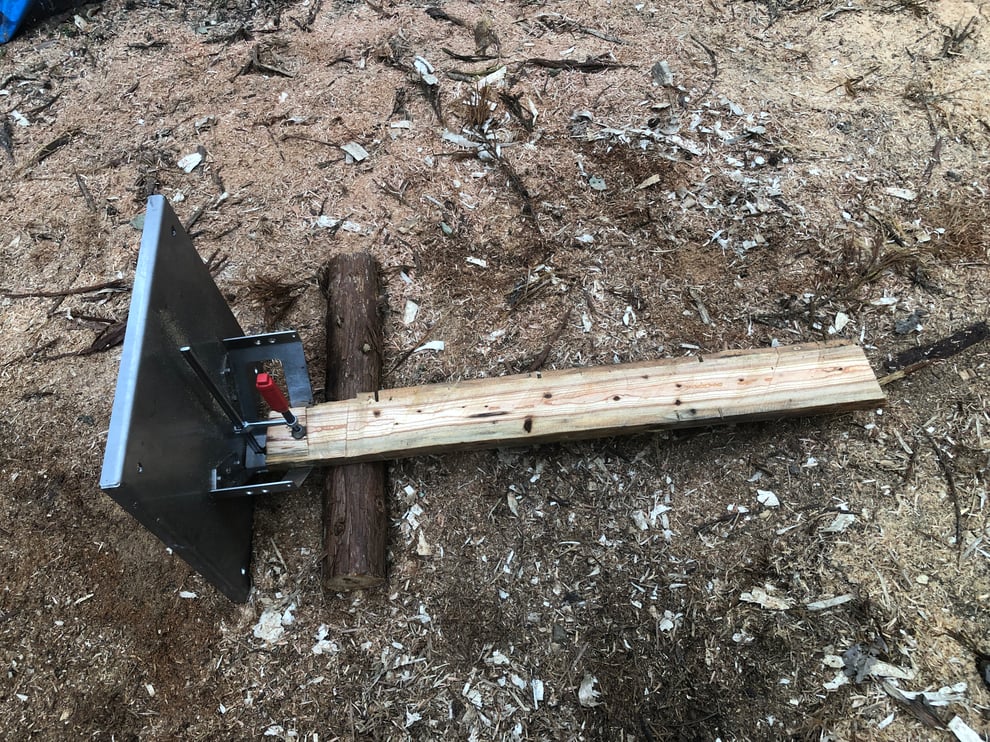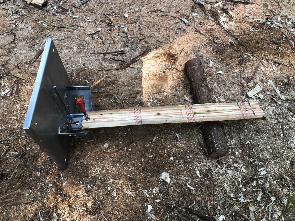 立介をはずし、チェーンソーが切り残した部分をクサビで割ります。
