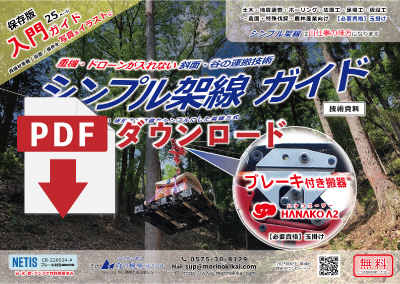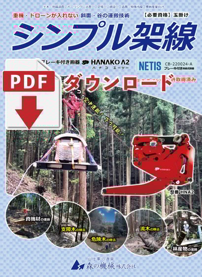 シンプル架線とは何か、シンプル架線の用途、運搬条件、必要な装備、ブレーキ付き搬器HANAKO A2の仕様を説明。