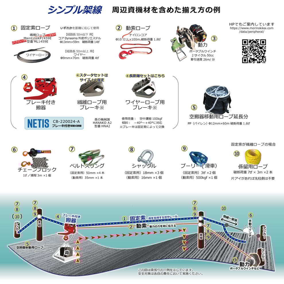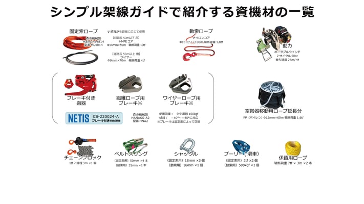 ここではシンプル架線を構成する主な資機材のうち、ブレーキ付き搬器HANAKO以外のものについてご案内しています。