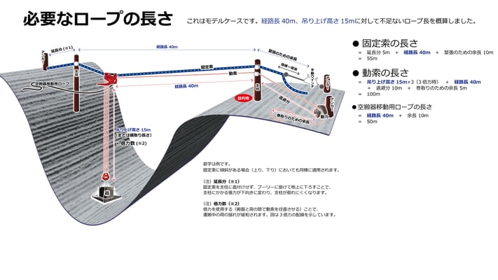 (目安)支柱間が50m→揚程3m、支柱間が100m→揚程6mを確保ください
