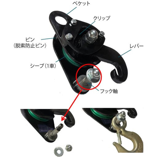 全体:200mm✕100mm✕90mm(厚み) シーブ径:Φ75mm フック軸径:Φ12mm |