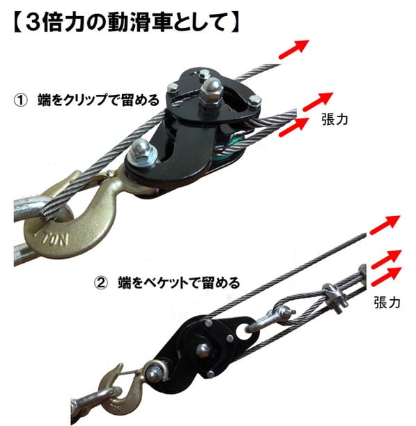 3倍力の動滑車としてのお使いいただく場合、ロープの端の止め方は二通りあります。