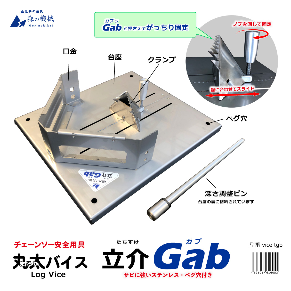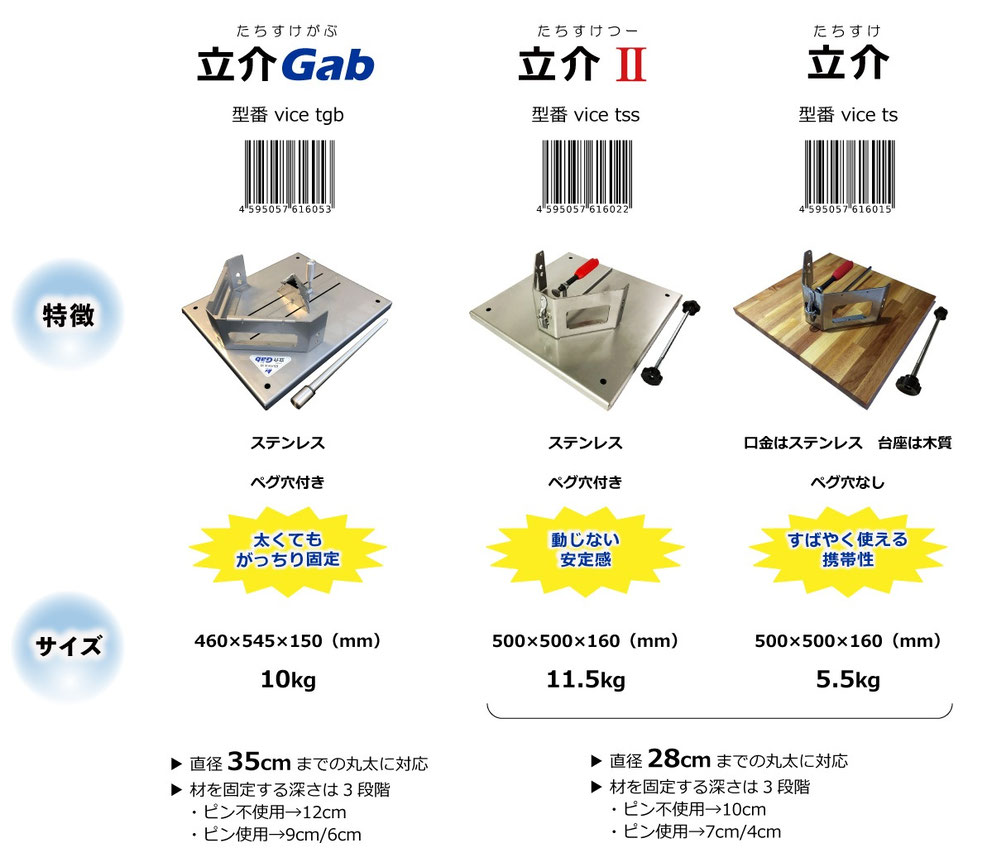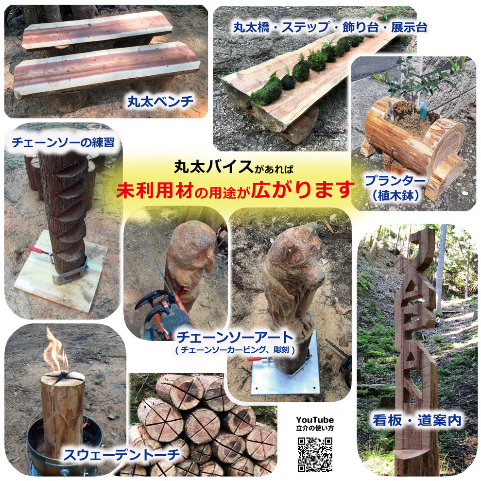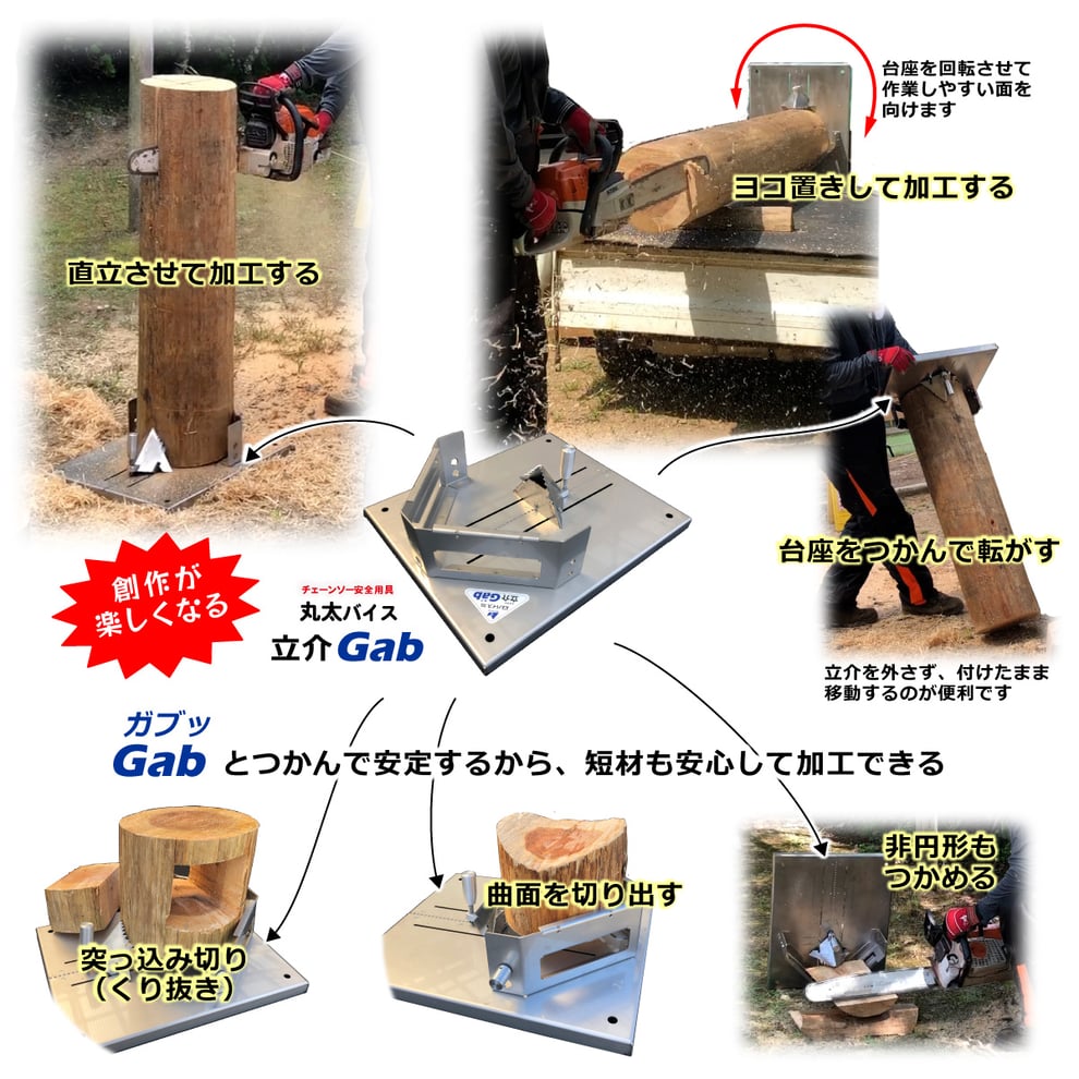 ▶ 丸太(まるた)バイス 立介(たちすけ) シリーズは 丸太を固定するチェーンソー安全用具です