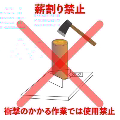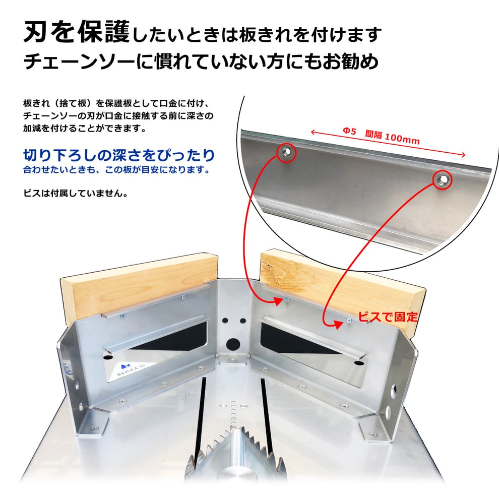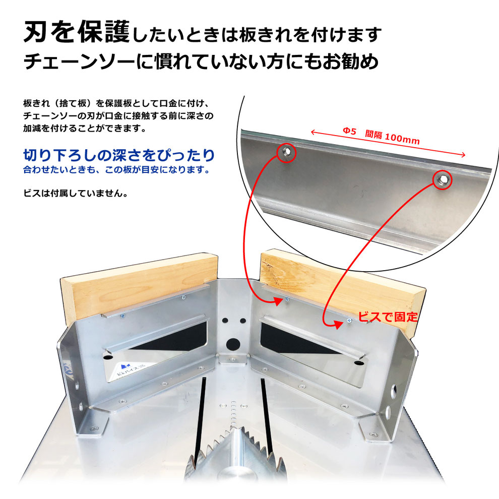 台座(四角形)が転がりを防止し、安定した角度でチェーンソーを入れられます