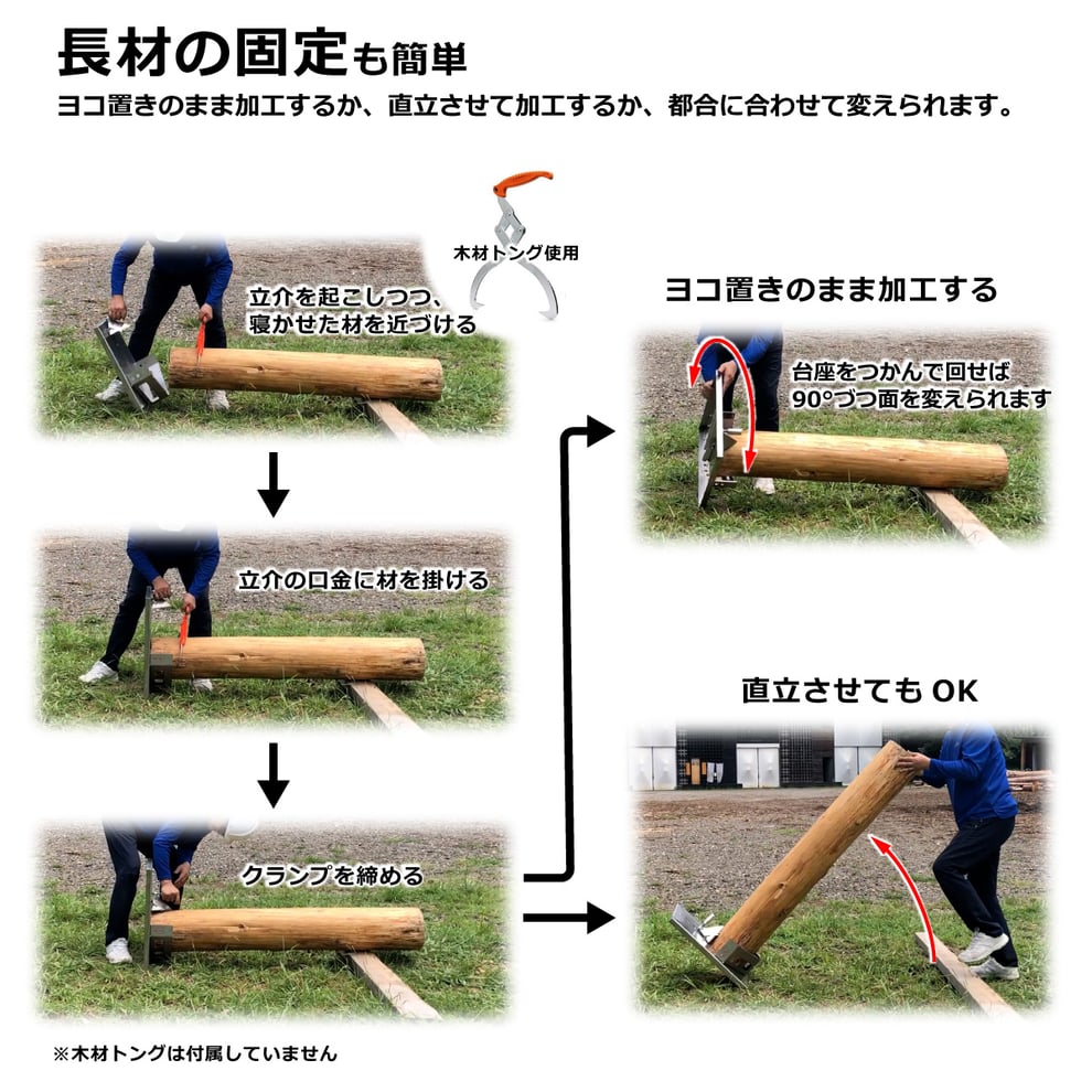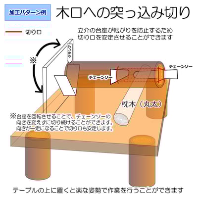 台座(四角形)が転がりを防止。丸太を地面から離してチェーンソーを当てられます